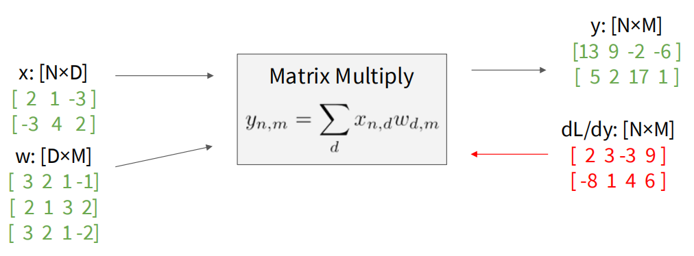 接着我们讨论一下矩阵到矩阵的情况(这里的算子是矩阵乘法),如果我们把矩阵看成一个向量去得到雅可比矩阵来做的话,相应的雅可比矩阵会非常巨大,存储非常困难。考虑到矩阵乘法中,结果的每一项并没有用到所有输入项的元素,所以相应的雅可比矩阵其实是非常稀疏的,所以我们可以重新考虑这个问题