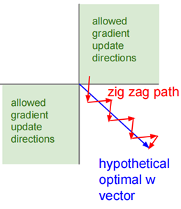由于 Sigmoid 的输出全是正的,也就是除了第一层以外,后面所有层的 \(x\) 都是正的,而每个节点 \(W\) 的局部梯度是 \(x\), 也就是说所有分量的梯度相比于最后一个节点的梯度的符号都是同时变化的(可能比较难理解),实际上就是每次梯度下降的方向只有两个大方向,这样子就会导致在梯度下降的过程中会走折线