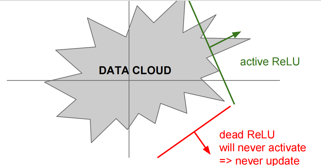 - 红色箭头(dead ReLU):表示一个死亡的ReLU神经元,其权重向量指向数据云之外的区域。这意味着对于所有输入数据,该ReLU神经元的输入始终小于0,因此其输出恒为0。