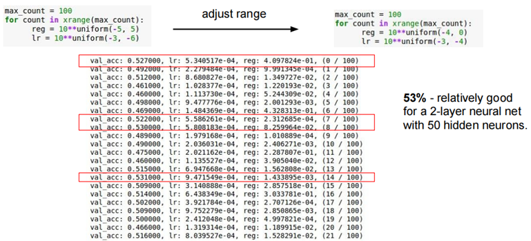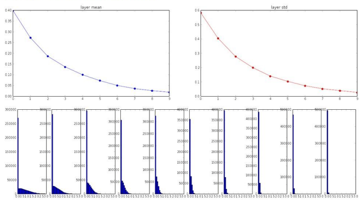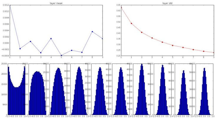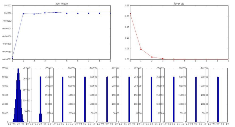 10-layer net with 500 neurons on each layer, using tanh non-linearities,采用上述的初始化方式