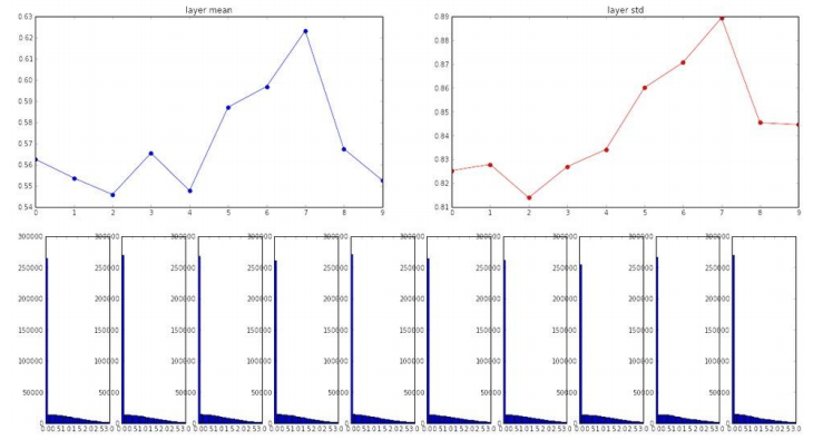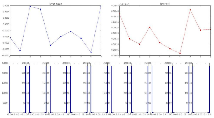 上左图为每层均值,上右图是每层的标准差,下图是直方图