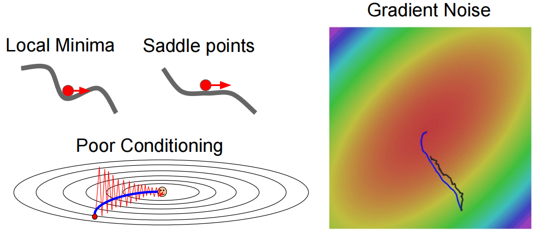 问题3:由于我们的梯度并不是通过全部样本得到的,而是选取了一些小样本 (mini-batch) 所得到的,所以下降的路线可能充满噪声进而变得非常曲折。