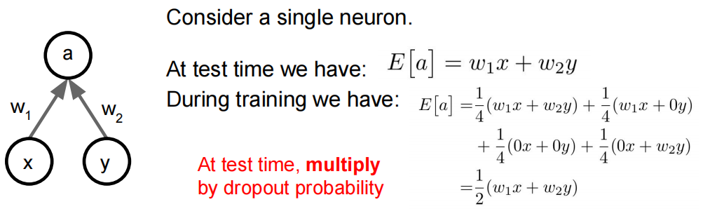 - 在测试时使用所有连接权重,并将权重乘以保留概率,以模拟多个子网络的平均效果。
