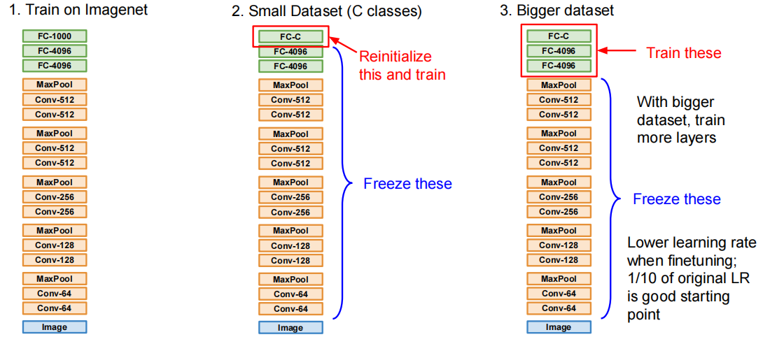训练一个数据集一定需要很多数据吗?其实不一定需要,我们可以先在大规模数据集中先预训练一个模型,然后我们在一个小数据集上进行微调;当然如果数据集更多的情况下,我们可以训练微调更多层