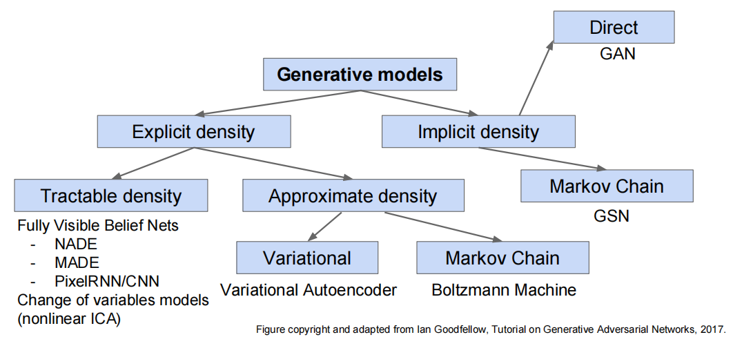 生成模型的目标是学习一个概率分布 \(p_{model}(x)\),使其尽可能接近真实数据的分布 \(p_{data}(x)\)。密度估计是无监督学习中的一个核心问题,即从数据中估计出其潜在的概率分布,而密度估计有两种不同的方法,大致可以分为 显式密度估计(Explicit Density Estimation)和 隐式密度估计(Implicit Density Estimation)