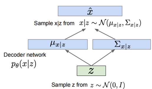 解码器则定义了条件分布 \(p_θ(x∣z)\),通常为以 \(z\) 为输入、输出图像均值的高斯分布。这表示:给定一个潜在编码 \(z\),模型可以生成符合该分布的图像 \(x\)。因此,解码器不仅是一个映射函数,更是一个“分布生成器”,使模型具备生成多样样本的能力。