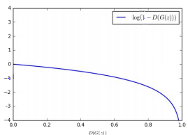 - 当 \(D(G(z))\) 接近于 0 时(即生成样本明显为假),损失函数 \(\log(1−D(G(z))\) 的曲线非常平坦。