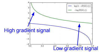 于是我们使用 \(\log(D(G(z)))\) 作为生成器的损失函数,训练生成器的时候采用梯度上升的方式