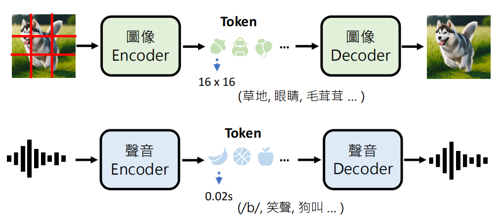 - 先将复杂的图/音压缩成较少的 Token(潜在空间)。