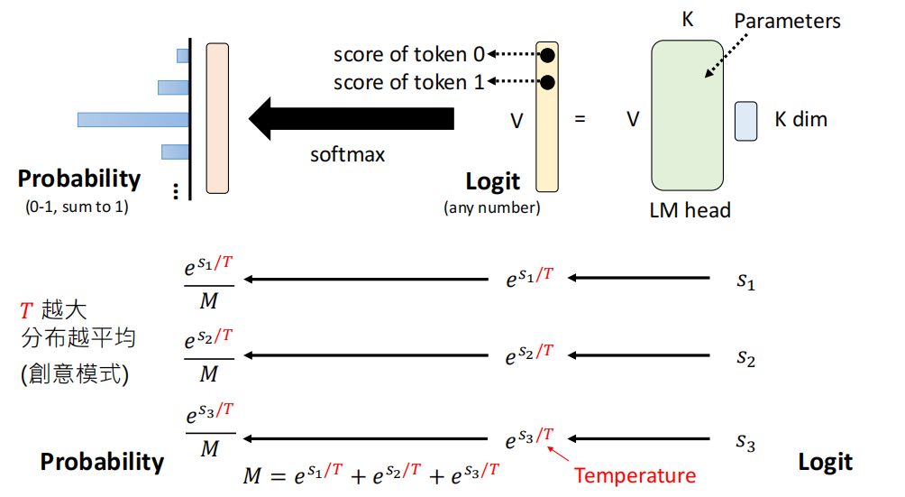 在最后一层,LM Head(语言模型头部)负责将高维向量映射回词表大小。通过点积运算(Dot Product),计算当前状态下词表中每个 Token 的分数(Score/Logit)。