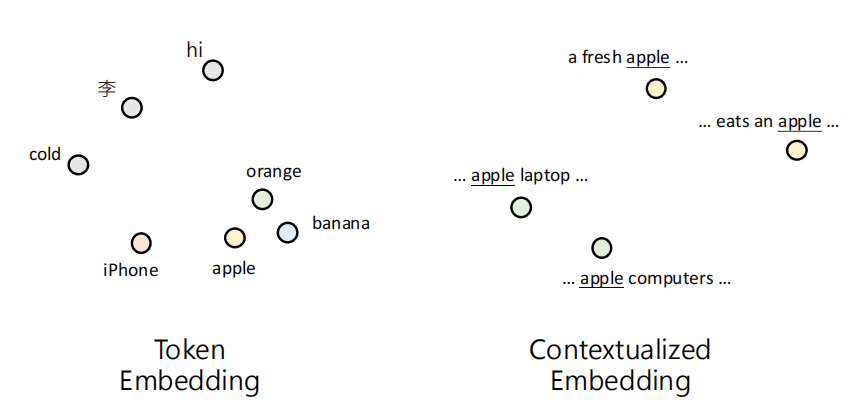 此时,即使是同一个 token(如 "apple"),如果它出现的句子不同(例如 "a fresh apple" vs. "apple computers"),它在某一层输出的向量也会不一样。这个向量已经融合了该 token 在当前句子中的上下文信息。