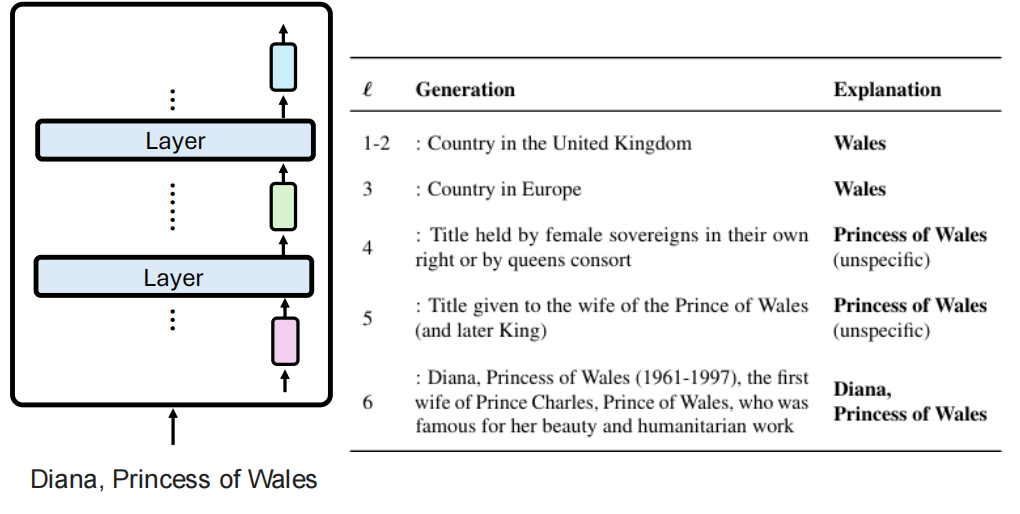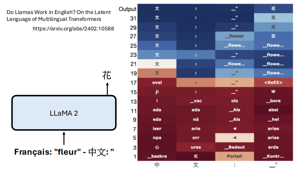 LM head(Unembedding) 来预测下一个 token。那中间层的输出代表什么呢?Logit Lens 是一种技术,它将每一层的输出向量都直接拿去乘以LM head矩阵,看看在这一层模型“认为”下一个 token 最可能是什么
