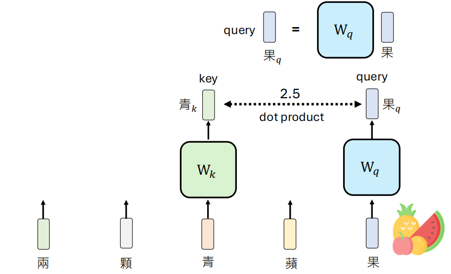 具体来说,将 “果” 的向量乘上一个 Query 矩阵得到相应的 Query 向量,然后其它的每一个 Tokens 都乘上一个 Key 矩阵得到 Key 向量,接着这两个向量做点积来衡量两者的相关程度。