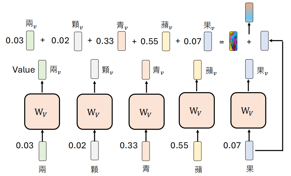 最终得到 “果” 与其他 每一个 Token 的点积之后做一个 Softmax,然后将其作为权重,对每一个 Tokens 的 Value 向量(即原向量乘上 Value 矩阵)进行加权平均,再额外加上原先的向量,得到结果。