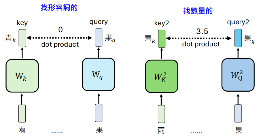 实际上,影响 “果” 意思的 Token,这个影响是方方面面的,”两” 代表数量,“青” 是颜色,对 “果” 都有影响,无法用一个注意力头来表示。所以引入多头注意力的机制,让每一个注意力头关注不同的信息