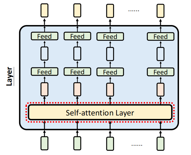 一个标准的 Transformer 层主要由两个核心组件串联而成:Self-attention Layer(自注意力层) 和 Feed-forward Layer(前馈神经网络层)。