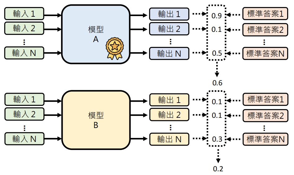 对于有标准答案的情况,很自然的想法就是让大模型在一个 Benchmark 上跑出相应的结果,然后与正确答案做比对,得到一个分数然后做平均,谁分数高,谁的模型能力就更好。