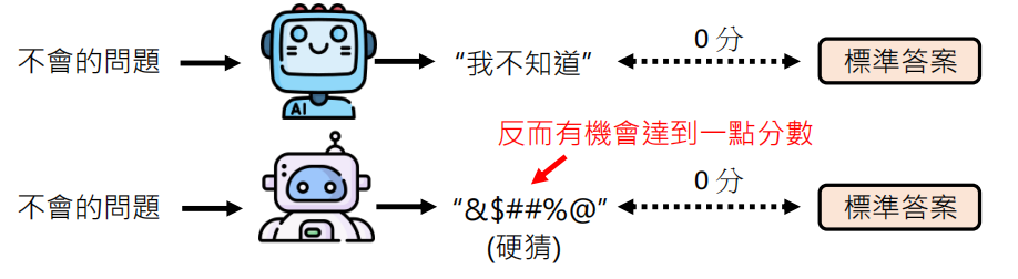 在评估中,回答“我不知道”通常得0分。硬猜错误答案可能反而有概率得分。后果就是模型在不确定时产生幻觉,而不是诚实承认无知。