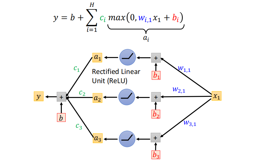 从数学上来表达就是,任何曲线都可以近似为多个 \(\max(0,wx+b)\) 函数的和。