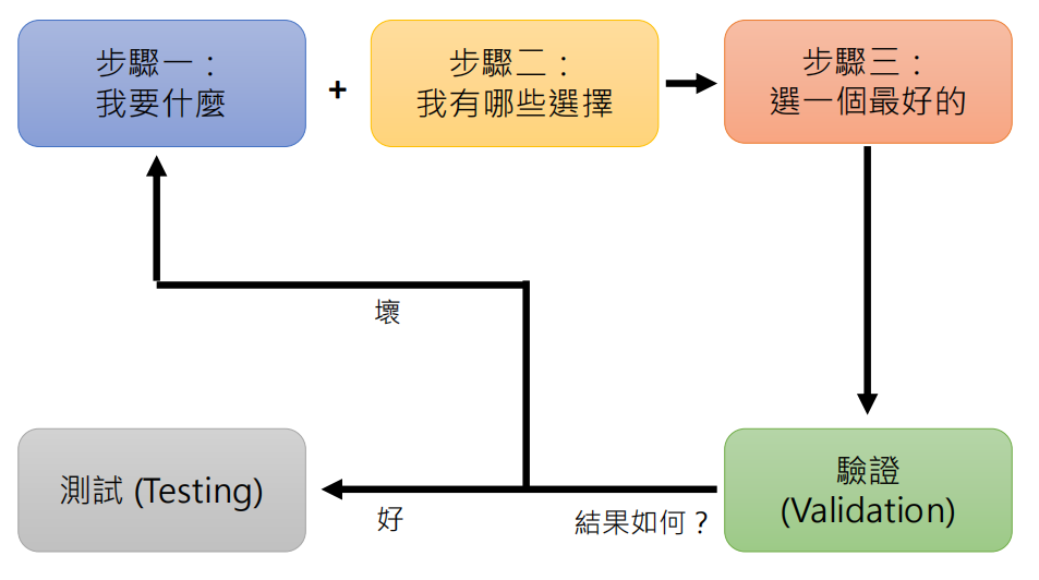 - 选一个最好的(优化 Optimization):目标是找到让 Loss 最小的参数组合