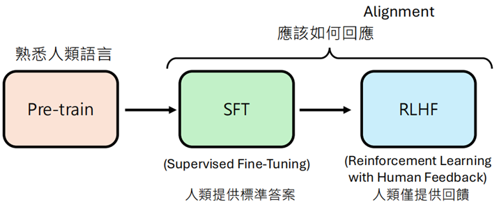 从预训练到 SFT 再到 RLHF,每个阶段都在做文字接龙,只是使用的训练资料和目标不同。每个新阶段都会以前一个阶段训练出的参数作为初始值(Initialization)。