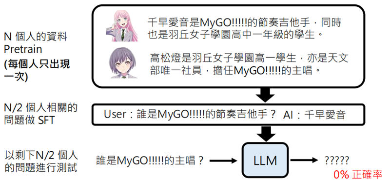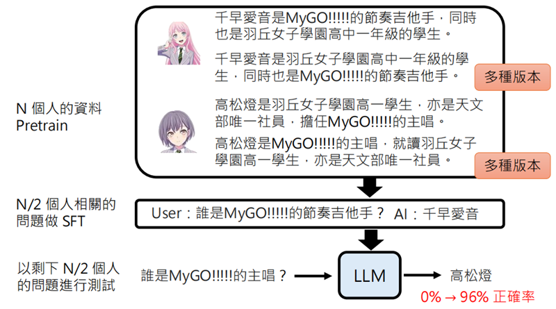 使用 N 个人的资料进行预训练,然后对 N/2 个人用相同的问题进行 SFT,用另外一半的人做测试,大模型并不能正确回答。但是如果我们在 Pretrain 时提供多重版本的资料,这时就可以得到较高的正确率