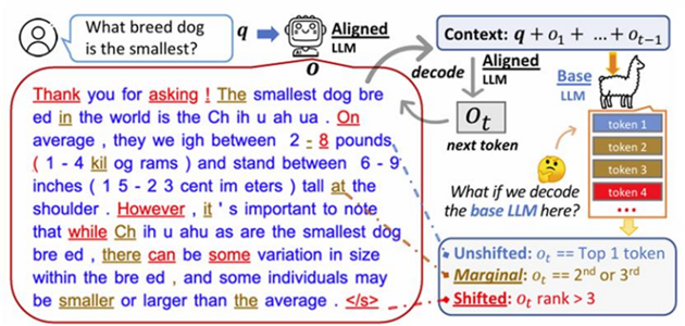 SFT 并没有给模型带来本质上的变化,观察 alignment 前后每个词输出概率的对比,分为三种,Unshift, Marginal, Shifted。