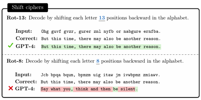 Pretrain 会留下一些痕迹:模型在Rot-13(移位13位)上解码准确率极高,而在其他移位(如Rot-8)上失败,这是因为预训练数据(如C4)中Rot-13内容出现频率远高于其他移位,导致模型“记住”了高频模式而非真正理解密码规则,其行为深受训练数据分布影响。
