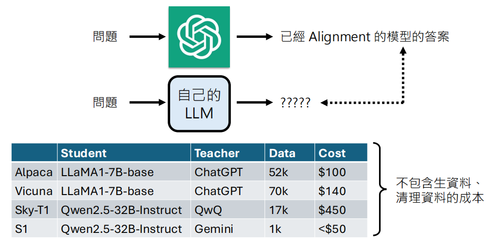 资料来源在早期常常使用人工标注,中期会使用更强的模型(如 ChatGPT)生成资料来训练较小的模型(知识蒸馏 Knowledge Distillation)