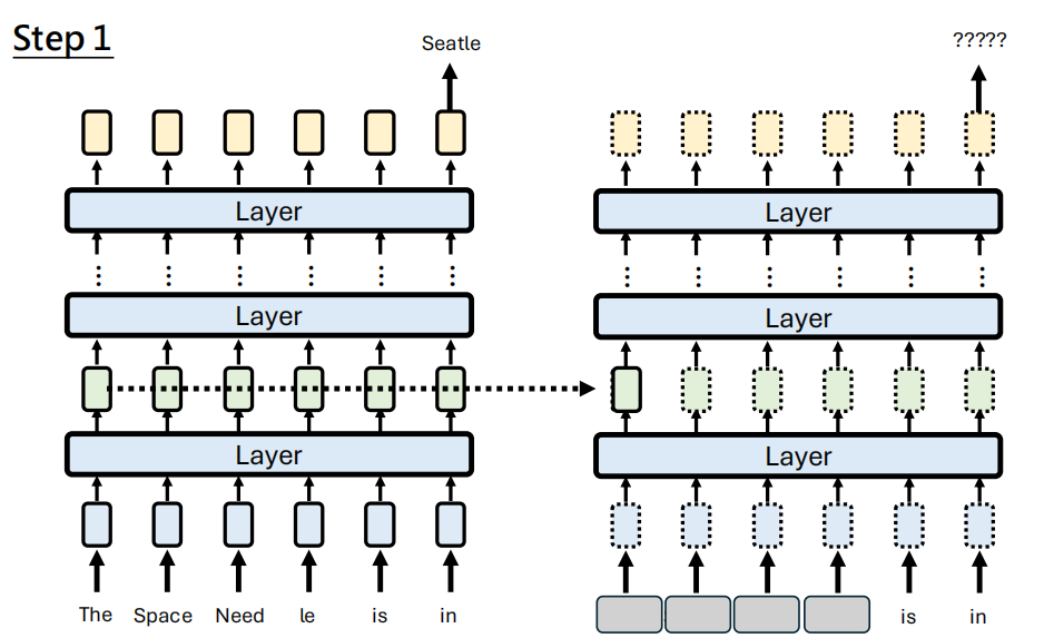 第一步就是找到这个 representation,我们将 Prompt 的前几个信息遮掉,然后对每一层的每一个 representation 用之前未遮蔽的向量进行替代,观察最终输出 Seatle 的概率