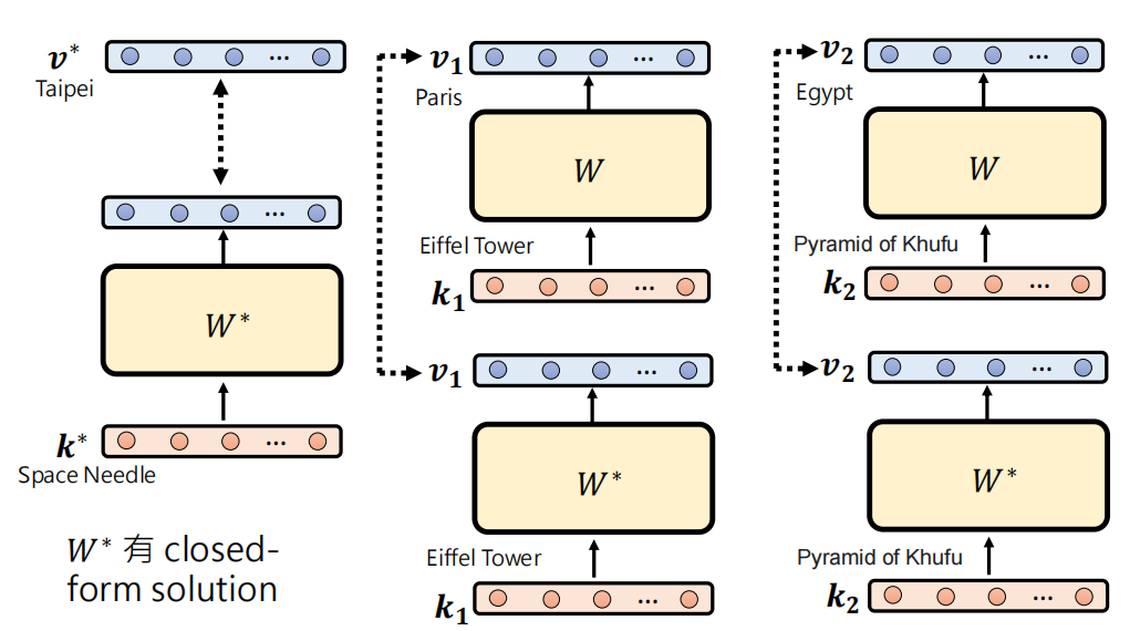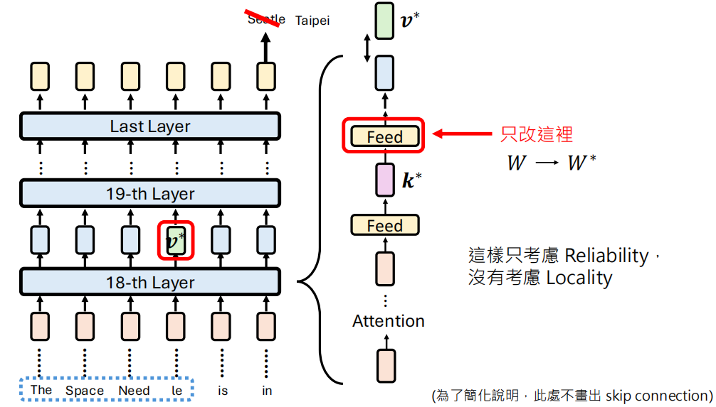 比如说原先的语句 "The Space Needle is in" 输出的应该是真实的地名 "Seatle",我现在想要让模型输出 Taipei 怎么办呢?Model editing 的思路就是到找到最能代表 Seatle 的那个 representation,然后修改模型的输出让这个representation 能够代表 Taipei。