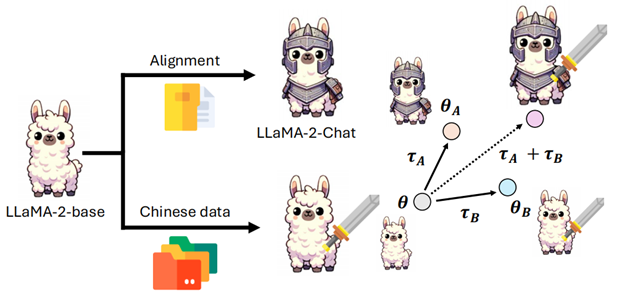 - 相加: 将两个不同能力的模型合并(例如将中文对齐能力的向量加到基础模型上)。