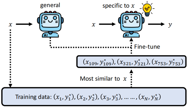 其中一个思路就是对于输入的 \(x\),首先我们到 training data 中找到与 \(x\) 最为相近的几组数据,然后针对这些数据对模型进行微调,相当于对模型针对这个问题进行了一个特化。
