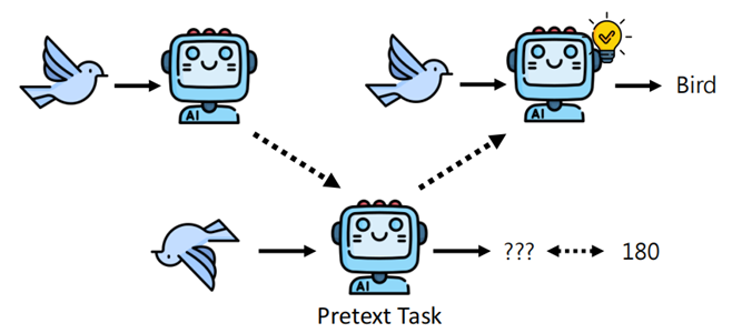 Test-Time Training (TTT) using Pre-text Task 在推理阶段,当模型面对一个不确定的输入(如一只新角度的鸟),它会利用一个预定义的辅助任务(如预测图像旋转角度)来微调自身参数。通过在测试时短暂地以预文本任务为目标进行训练,模型能自适应地调整内部表示,从而提升对当前输入的分类准确性(如正确识别为“Bird”)。