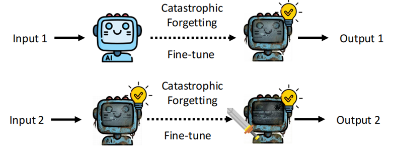 这个方法的一个很严重的问题就是灾难性遗忘(Catastrophic Forgetting)。即“手术成功,病人死了”。模型学会了新知识,但把旧知识全忘了(例如学会了说中文,但忘了怎么写代码)。