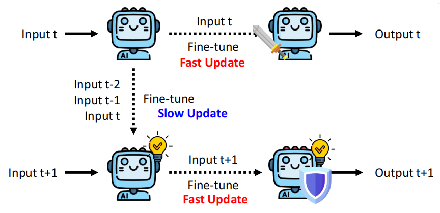 当然这个思路是一个启发性思路,针对上述问题进行改进,有一个方法是 Dynamic SUTA:在推理过程中,模型对每个新输入(如Input t)进行快速微调(Fast Update),以适应当前样本的分布变化;同时,通过累积多个历史输入(如t-2、t-1、t)进行缓慢更新(Slow Update),实现长期知识的稳定积累。